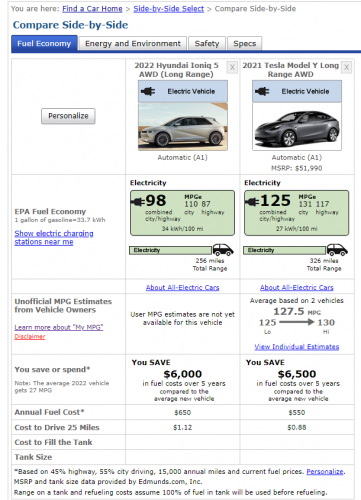 Energy Cost Comparison - Tesla Model Y vs. Hyundai IONIQ 5