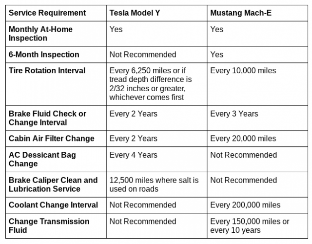 Our chart above takes its information directly from the Tesla and Ford owner’s manuals. We’ve included links to the manuals at the bottom of the page for your convenience. As you can see, the Tesla Model Y and Mustang Mach-E will both require some sort of service at least every 6,250 miles or every six months. That is a frequency similar to many ICE vehicle oil change intervals.