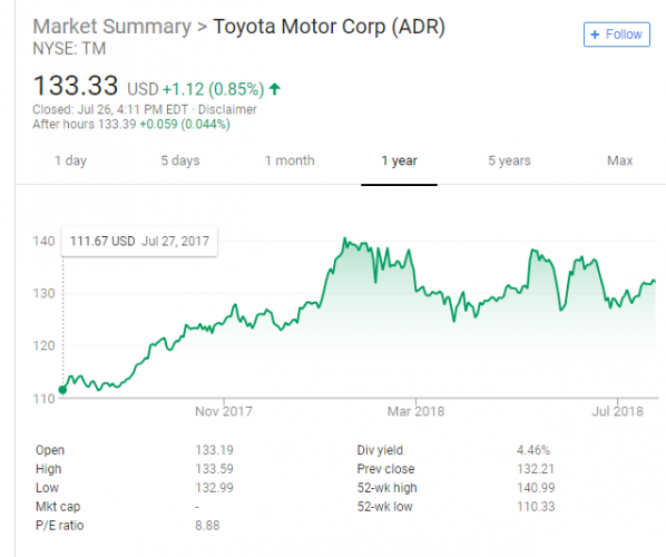 We've opted to stick to stocks listed on American exchanges traded in dollars. Over the past year, the Dow Jones industrial average has dramatically outpaced Tesla stock and Toyota looks to be the big winner in terms of stock price gains for the past year in the auto segment among major automakers.