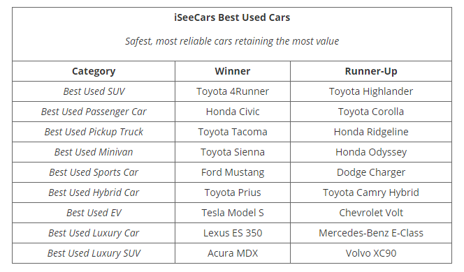 Our friends at iSeeCars.com have been busy trying to determine which used cars are the best overall picks. If we could sum up their conclusions in one quick word it would be "Toyota." Toyota makes the vehicle the shopping and research site named the Best Used Vehicle for 2020 in four of nine categories and is a runner up in three more. There's even a Lexus on the list.