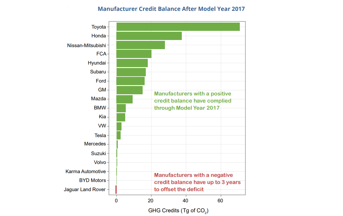 As out top of page shart shows, Toyota is dominating this program and Honda is also doing quite well. The results shown at the top of the page are how many extra credits the automakers had as of the report creation in October of 2018. It is the most up to date data available.
