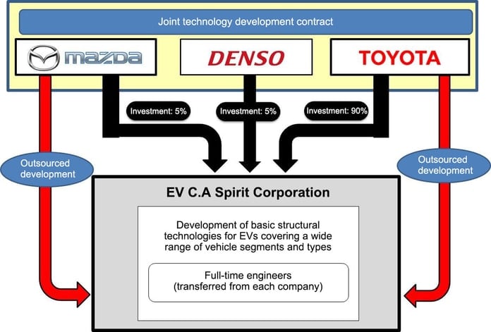 The plan is to develop a common EV architecture that can be validated and adapted to a variety of EV segments. Toyota also points out that EVs have yet to gain any significant acceptance in the marketplace, making a solo effort cost inefficient. Thus, the three partners will each send engineers and resources to work at a new corporate entity based in Nakamura, Nagoya, Japan. The company will initially employ 40 persons and Toyota is expected to bear the burden of about 90% of the costs and thus have about a 90% equity stake.