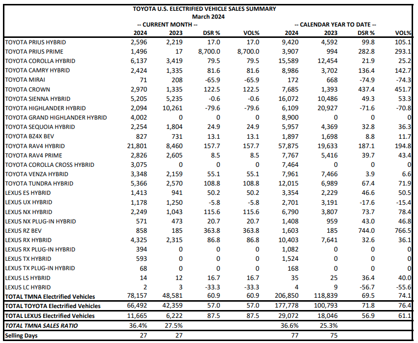 Toyota’s Q1 U.S. delivery results are out and hybrids are selling like gangbusters. American preference for hybrids and plug-in hybrids could not be more evident. Combined, Toyota and Lexus’ electrified vehicles grew by 74% in Q1 2024 vs. Q1 of last year. Toyota’s electrified vehicles include fuel-cell electric vehicles, battery-electric vehicles, plug-in hybrid-electric vehicles, and two types of hybrid-electric vehicles Toyota calls standard and max.