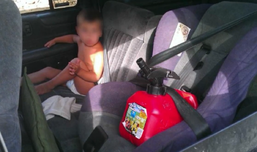 We all remember the video of Brittany driving her 2-seat convertible with a baby on her lap. That image now takes a back-seat to the one shown here. According to multiple sources including 9 News in Colorado, a vehicle with four occupants, none of them belted, was stopped for making an illegal turn. During the stop, the photo was reportedly taken by the police. Inside the car was a toddler, unclothed, but for a diaper, “improperly restrained.” Next to the child was a gasoline container in a child car seat, apparently strapped in. Setting aside that the child should have been in the seat, why would any parent transport liquid fuel in a car with children inside?