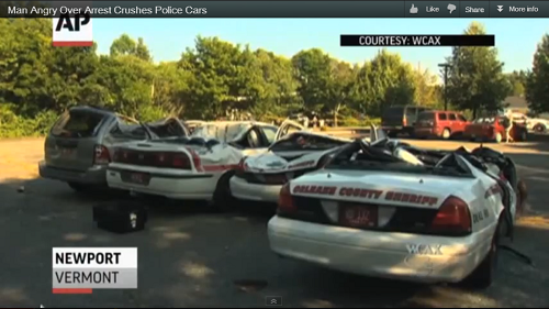 A Vermont man is accused by police of running over 7 of their vehicles with a tractor. Associated Press reports that while police were inside enjoying the cool air of air conditioning, a man was in the parking lot crushing their cars with a giant farm tractor. Apparently, the narcotic-like hum of the AC masked the sound of a ginormous tractor smashing 7 cars to bits on the other side of the wall. Hmmm. It seems like this might be another case of the media missing the real story.