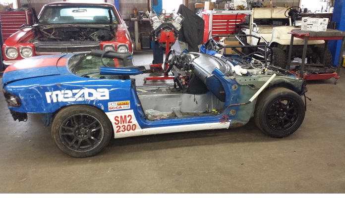 We found one such "fully depreciated" Mazda Miata, an NA generation, as you can tell from the image, at Mark McMullen's garage, G&M Services in Millis, Massachusetts. Mark supports a race team with technical and mechanical services from his shop and also at the track. His team has run Miatas for a decade over two generations of the car.