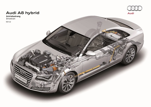 Audi has introduced the new A8 hybrid and has made fuel savings its main goal. Using a four cylinder turbo engine coupled to a heavily modified 8 speed automatic transmission, Audi claims best in class fuel economy numbers. Although not yet rated by the U.S. EPA, the European cycle numbers indicate that the A8 Hybrid will far exceed the fuel economy of either the BMW ActiveHybrid 7, or the Mercedes-Benz S400 Hybrid sedan. What is not in question is that the Audi A8 hybrid will be the slowest of the three by a pretty wide margin.