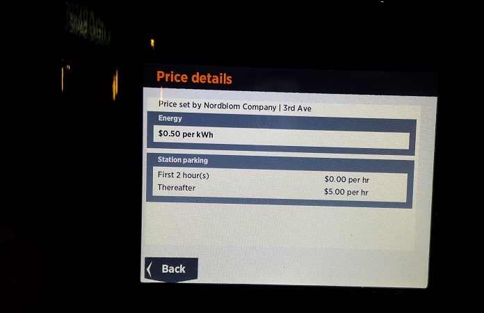 During our testing of the new 2018 Hyundai Ioniq Electric in Massachusetts this week, we used the infotainment system to find a nearby charging station. The vehicle directed us to a new outdoor mall area in Burlington, Mass. and we made a dinner reservation for a restaurant in the plaza. When we arrived, the single charging spot, among hundreds of public spots, was occupied by a Toyota Prius Prime. When we left over two hours later, it was still in the spot charging, even though it must have been full, given its small battery capacity. That was an interesting real-world observation for our review notes, but what struck us was the cost displayed on the charger. Fifty cents per kWh.