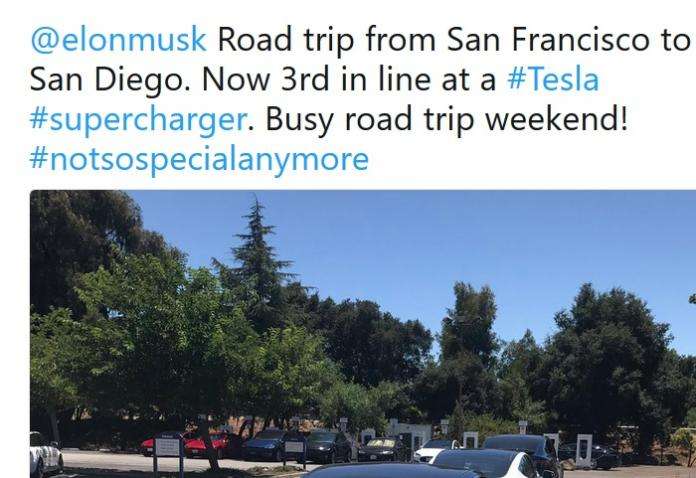 @elonmusk Road trip from San Francisco to San Diego. Now 3rd in line at a #Tesla #supercharger. Busy road trip weekend! #notsospecialanymore pic.twitter.com/hN3l6xE23X