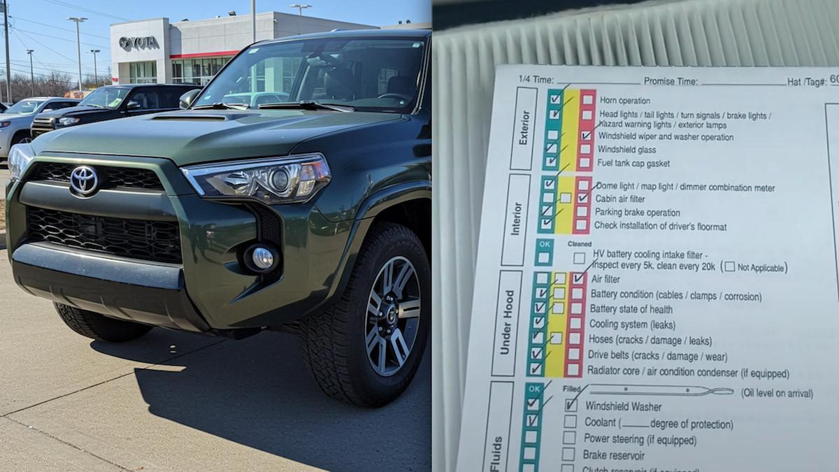 Tiffany shows the Toyota dealer's checklist of items that need to be serviced or changed. The checklist has green items that are good, and the red boxes are items that need to be replaced.