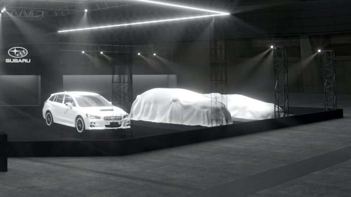 The image above clearly shows the covered model is an SUV, and every other model at the Subaru exhibit is a performance model developed by Subaru and STI. Subaru says all the models come equipped with STI performance parts "to make these models sportier and deliver greater enjoyment."