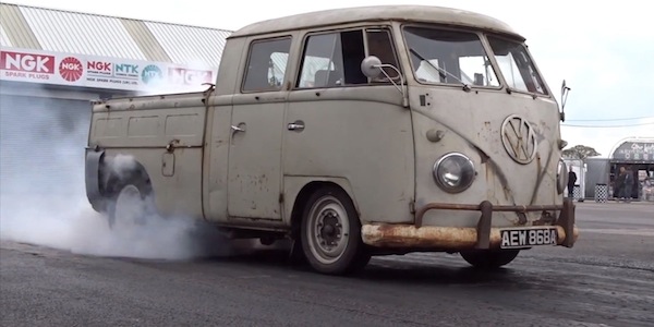 Take a rusted out old 60s style Volkswagen Double Cab bus with a pickup bed and swap the old air-cooled engine with a Subaru WRX STI powerplant and it becomes a drag star at Santa Pod Raceway in the UK. We are told that this Subaru-powered VW bus is putting out 560hp from the 2.5-liter STI boxer engine.