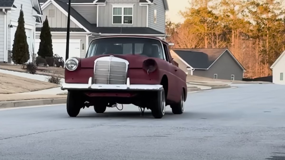 Chase says the truck was supposed to be a project with a $10,000 budget. He bought the 1940s Mercedes car from his Grandma for $800 and found a 1989 Toyota Tacoma T100 for $1,000. They swapped the body to the Tacoma's chassis and added hydraulics.