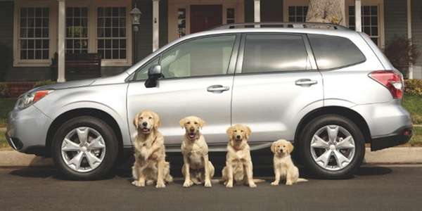 The Subaru ad features four purebred golden retrievers that are riding in a 2014 Subaru Forester. The Subaru ad is called “Dog tested. Dog approved.” The four golden retrievers are driving and riding in the Forester when they spot a mail-delivery truck. The dogs have a hard time containing themselves and do what any truck-chasing dog would do.