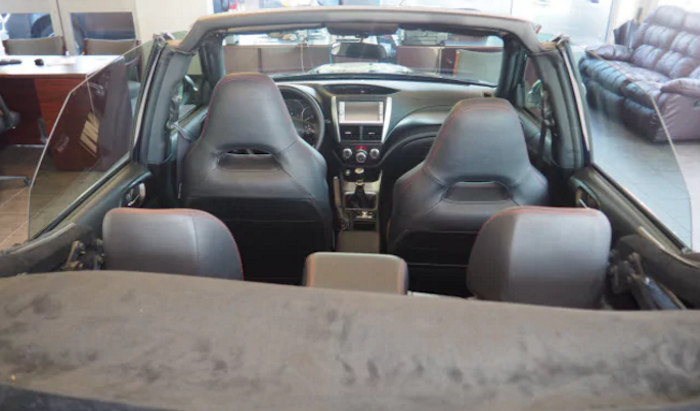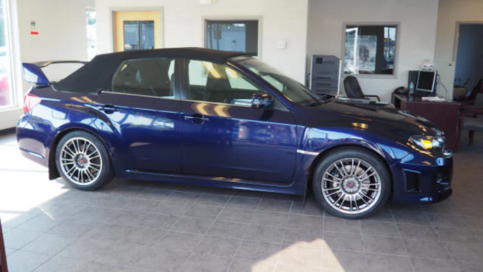 Would you buy a Subaru WRX STI Convertible? It’s available for sale at Manchester Subaru in New Hampshire. The 2011 WRX STI for sale is a real model and it was modified by Newport Specialty Cars in Placentia, California. The custom body shop specializes in chopping the top off cars and SUVs not currently offered as convertibles.