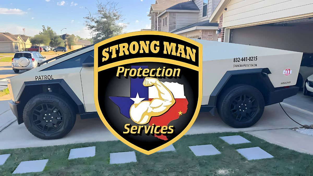 The Cybertruck has a sand color wrap prominently featuring the Strong Man Protection Services logo. The logo features a curled bicep with the Texas map as its backdrop, ensconced in a shield with the words STRONG MAN Protection Services written on top.