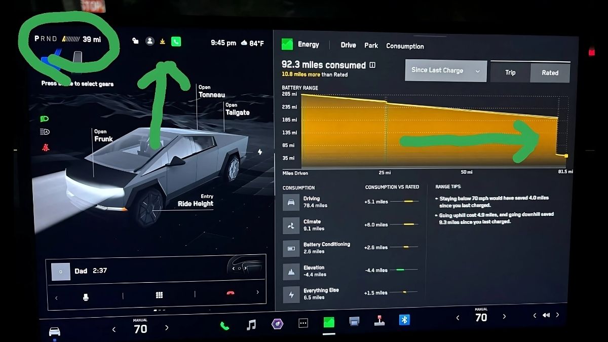 The Cybertruck shows 39 miles remaining. However, looking at the consumption graph, it appears David left his truck at the airport with 200 miles remaining.