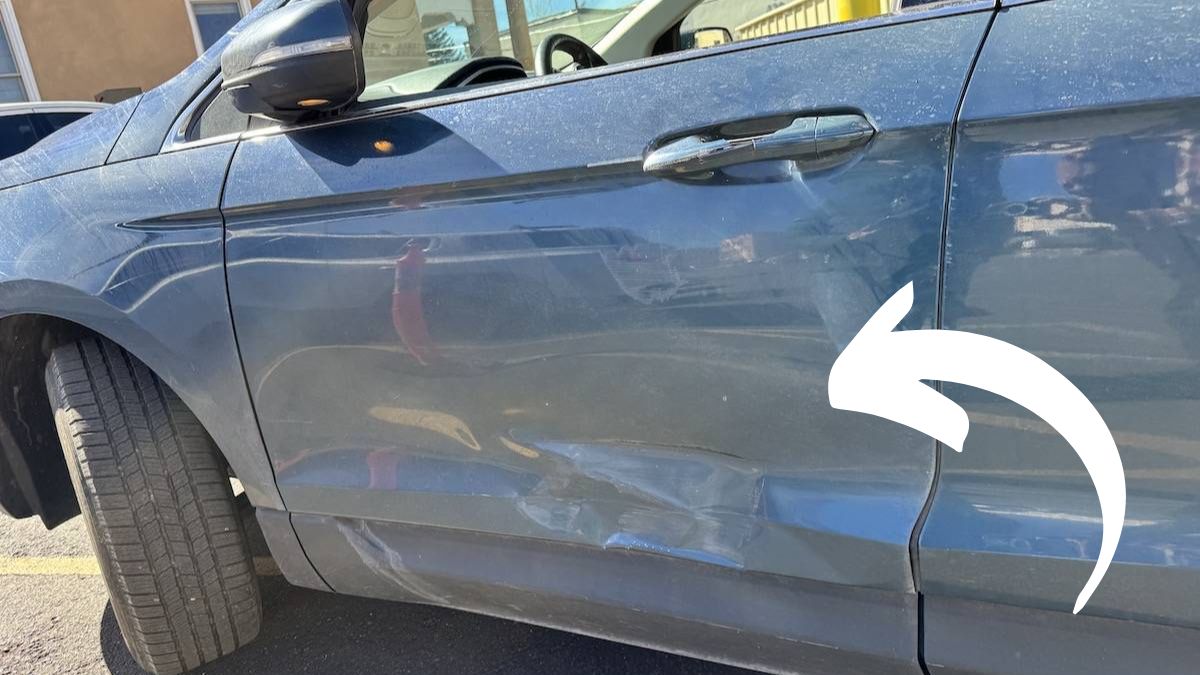 The old lady’s Ford Edge is noticeably damaged. The driver's side door is dented inward, and the door handle is broken.