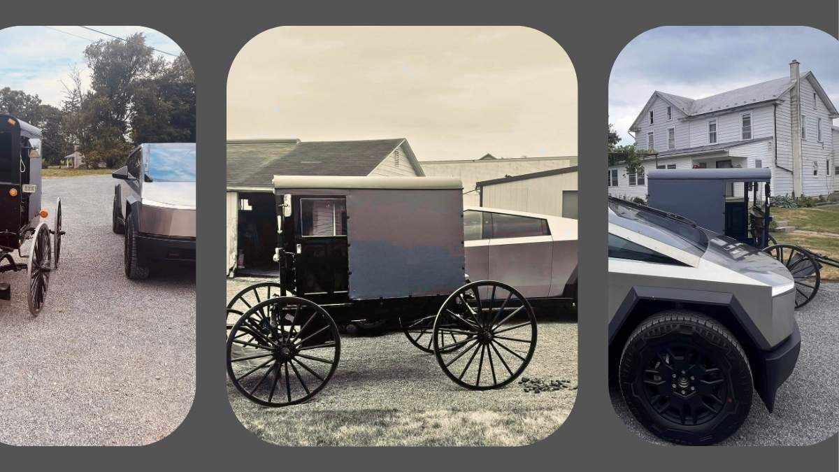 The pictures show the Cybertruck next to a horse-drawn carriage surrounded by barn structures and an Amish house.
