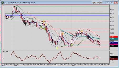 Looking at the weekly chart, especially note the lows of October and December of 2011. At 19.05 and 19.00 respectively, this clearly defines a double bottom. Question now is, will GM stock produce a triple bottom? Furthermore, will that bottom hold or fail?