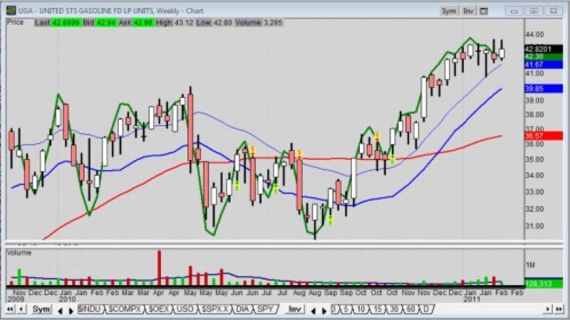 Note the rising trend of UGA on the weekly chart, the exchange traded fund (ETF) that tracks gasoline.