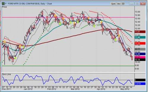 Not too much has changed for Ford stock since I reported last, except the trend bias towards the downside has indeed gotten worse. Sure, this Friday is option expiration, when volatility fills the air for all stocks. Then again, the JP Morgan (NYSE: JPM) bank trade bumble of $2 billion, along with Greece who still cannot decide on how austere it needs to be, are taking its toll on trading mindsets these days; albeit JPM had a decent day today rebounding.