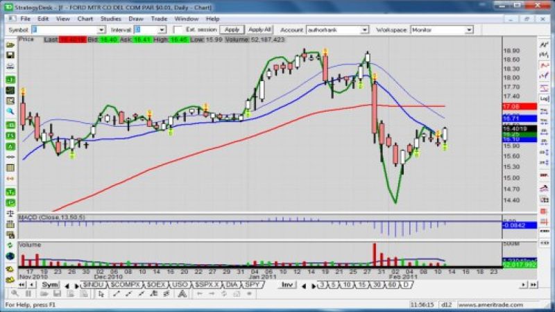 For the record, though, the day chart shows Ford stock trading within the 13-day moving average channel (blue). However, the channel and the day bars are trading below the 50-day moving average (red), which, from a trader perspective, is still corective; or, as some say on CNBC, cautiously optimistic.