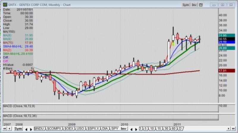 One look at the monthly chart of Gentex stock (Nasdaq: GNTX), the trend has been positive in the bullish direction. In fact, there is strong price support in the $26 area going back to March, 2011.