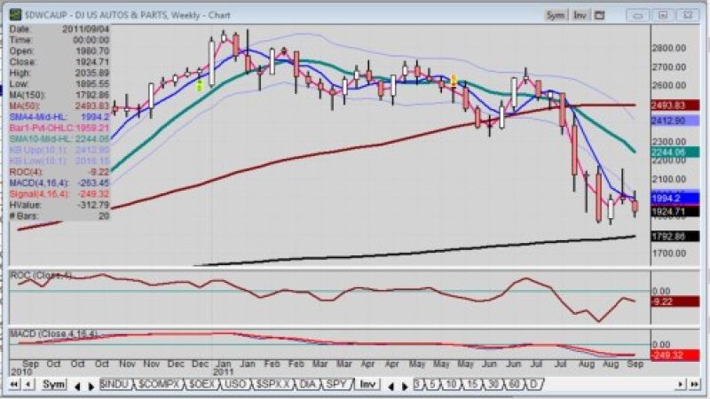 Contrary to popular belief, buy-and-hold strategies for stocks in the Dow Jones U.S. Autos & Parts Index (see weekly chart of $DWCAUP) which includes GM, Ford, Toyota and other auto sector stocks including suppliers, are not working very well.