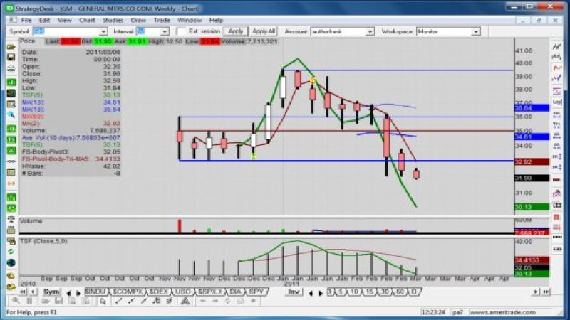 That green technical line on the weekly chart represents the Time Series Forecast that I use extensively, because it is not a laggard like moving averages. As of noon on Monday, it is indicating 30.11. Personally, I’m not long on GM stock until that line rises, and it will rise first on the daily chart before it shows up on the weekly.