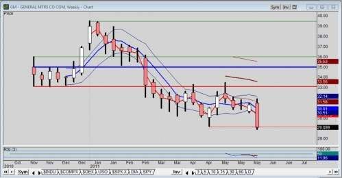 The weekly charts sums it up best for General Motors stock (NYSE: GM). Note that previous low of 29.17 in April has been officially broken intraday to the tune of 28.90. New lows are significant events, because they imply more to come or a bottom event.