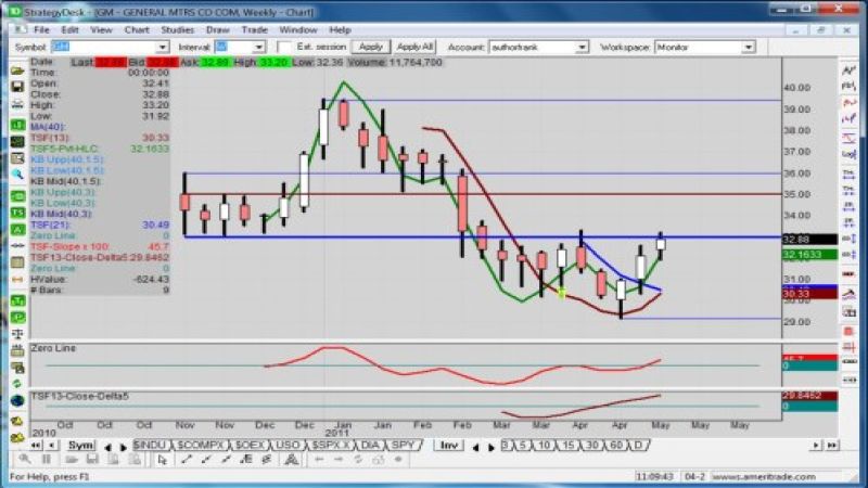 The weekly chart shows a clear macro view of GM stock's price dynamics since its IPO. Market Close Update: Per the latest quote via TD Amertirade, GM stock closed Tuesday at 32.99, a penny away from its IPO price of $33.