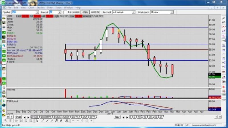 In the case of the GM stock chart, I have chosen the TSF5 or 5-period based on the close, and the TSF21 based on both the high and the close, thus creating a channel. Unfortunately, the weekly chart lacks sufficient data points to see the channel.