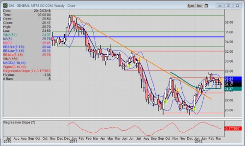 Of course, the weekly chart of GM stock doesn’t seem too impressive. Since its IPO in November, 2010, the stock made its highest high of 39.48 within a couple of months. Since that time, though, GM stock tanked to a low of 19.00 and 19.05 for a double bottom. The stock closed last past Friday at 25.17.