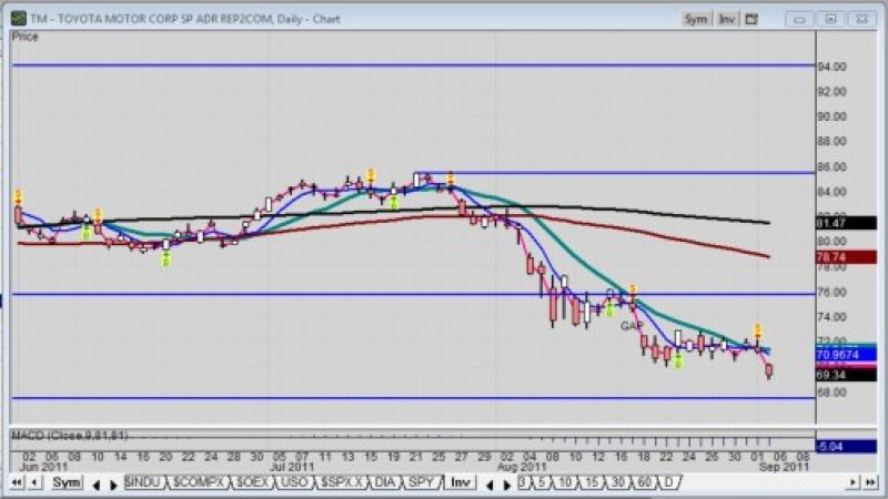For the record, on July 21, Toyota stock traded at 85.49. Then on July 27 the stock broke downward with a significant price gap which was never even challenged. That was followed by a lower price gap on August 4th which was never challenged either; and that was further followed by another lower price gap on August 18.