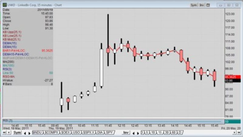 Witht an extreme day high and an established low minutes after the open, LinkedIn stock has a wide trading range on its very first day. With the low established at $80, the stock soared to $122.69 as a new high, then tumbled thereafter in the afternoon to $103 area. LNKD finally closed at $97.86.