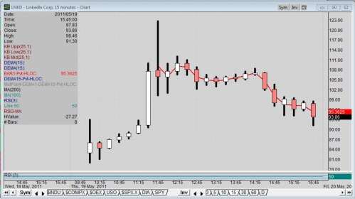 The 15-minute charts shows the trading day of LNKD in all its glory and volatility. A morning snapshot of the stock price taken and reported earlier gave LinkedIn (NYSE: LNKD) a market cap of over $8 billion; the new high raised that to nearly $9 billion but only for while.