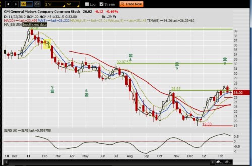 Right now, GM stock is pausing at the 26.55 level. In fact it broke out slightly higher then fell back.