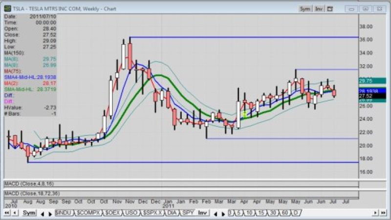 The weekly chart above of Tesla stock does not show a stock in any great distress, in my opinion. It’s trading literally near the middle of past support and resistance, its major high and low, which is just above its mid-point of 25.15.