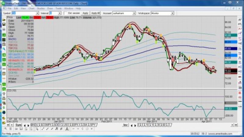 Since the stock’s double top at the end of February in the 94 range, Toyota stock has languished down to its present level below 77. The chart shows the stock trading well below its 50-day moving average, a key technical tool that traders use to define bullish and bearish positions.
