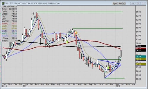 Then again, just like the hoopla of NAIAS 2012, all enthusiasm comes to an end or dies down; and there may indeed be a pullback to the broken resistance level. So, waiting for the pullback at least insures to a greater degree that Toyota’s trend bias has changed from bearish to bullish.
