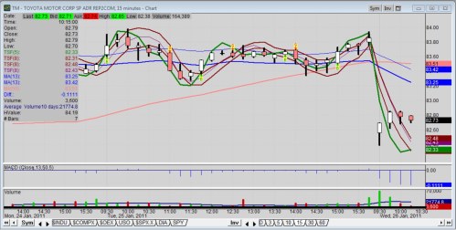 Day traders use intra-day charts like 5, 10 and 15-minute charts. According to the 15-minute chart shown, Toyota stock found buyers right after the open, but met resistance at 10:45 a.m. at 82.85.