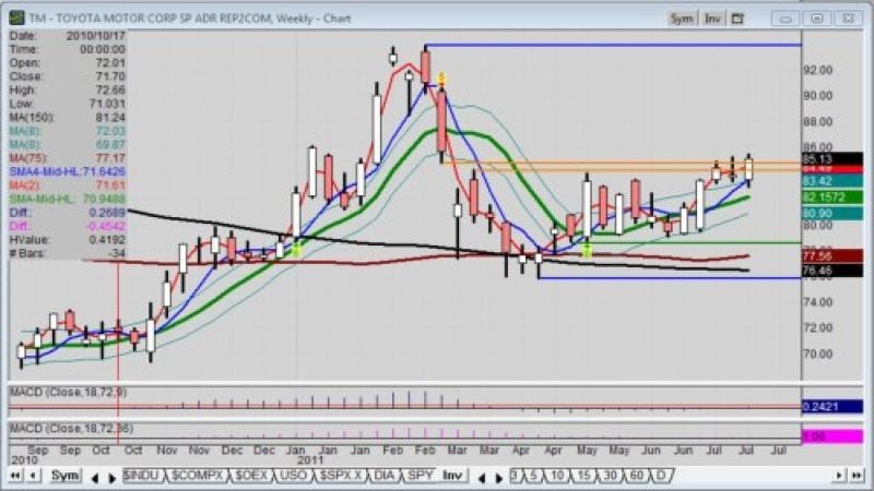 As reported here at Torque News, Toyota stock started the entire up-move weeks ago, then broke the early May high of 84 by closing at 84.16. Question at the time was, could it be the breakout to higher highs? And, if so, would it be the result of all the 2012 Camry news on the web, like the TN article by Patrick Rall? Read: The 2012 Toyota Camry leaked in video and pictures