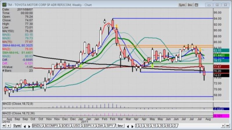 Last month as Toyota stock was challenging a price gap at 84 level, I asked the question: Will that 2012 Toyota Camry be enough news to empower the stock through an upside gap? Now I have to ask, will the 2012 Camry be enough to keep Toyota stock from plowing below the next major support at 67.56?