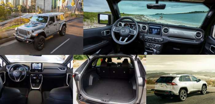 Toyota’s off-roading technology has delivered consistent performance from many different platforms. The Hilux is noted as being nearly indestructible and the Land Cruiser has found itself in everything from rap videos to official military service. With such a pedigree, the RAV4 Prime is also gifted with technological enhancements to make tackling anything the road or trail can throw at you easier, like all-wheel-drive, though it does not have any specific off-roading focus in its selectable modes. The interior of both vehicles are comfy and of course the Jeep uses the UConnect infotainment system that we know and love.