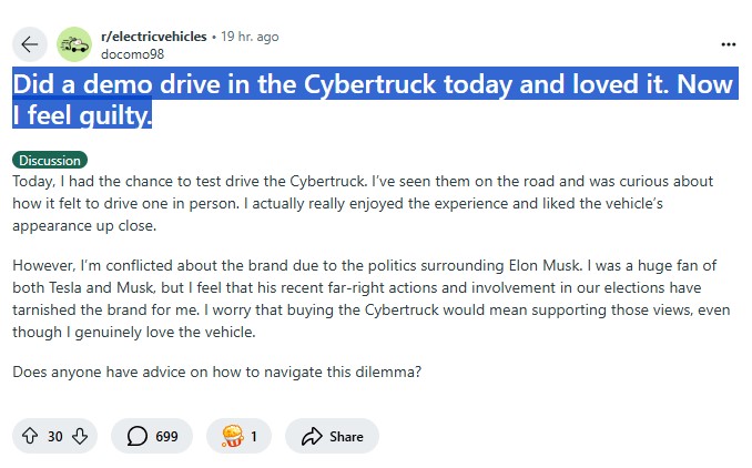 A recent Reddit post on the r/electric vehicles group reveals that, not surprisingly, politics is on everyone's minds lately―even to the point where one shopper admits finding himself conflicted over buying a Cybertruck because he likes the Cybertruck but is turned off by Elon Musk's political views and involvement in this Presidential Election.