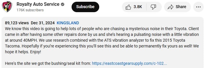 Looking a little deeper into what could be the cause of the noise, the host discovered this is a situation familiar to some years of Toyota models due to one of the most common modifications owners like to do with their Tacoma, Tundra, and 4Runners―put on bigger wheels with a lift kit.