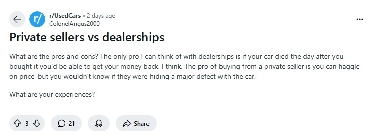 The Reddit post originated with an OP asking for some guidance on the pros and cons of buying a used car through dealerships and private sellers with his take on what he believed to be true about both.