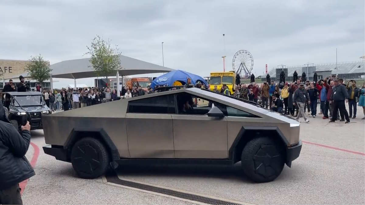 Onlookers cheered, "Cybertruck! Cybertruck!" as it slowly drove around in a circle-like pattern, watched by the crowd. Another person can be heard saying, "Look At That!"