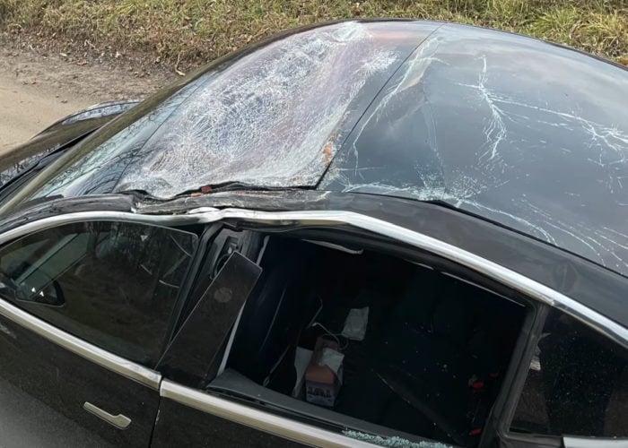 We have some photos of the aftermath of the tree falling on the Tesla and they can also be seen in the linked video here at the bottom of this article. We are truly grateful that nobody was hurt by this unfortunate accident. Some think that this kind of accident has a million to 1 odds.